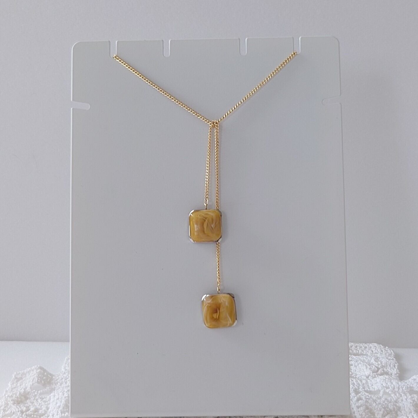 約2cmの存在感あるアンバー調のボタンが、胸元にやわらかな光と温もりを添えるネックレス。
