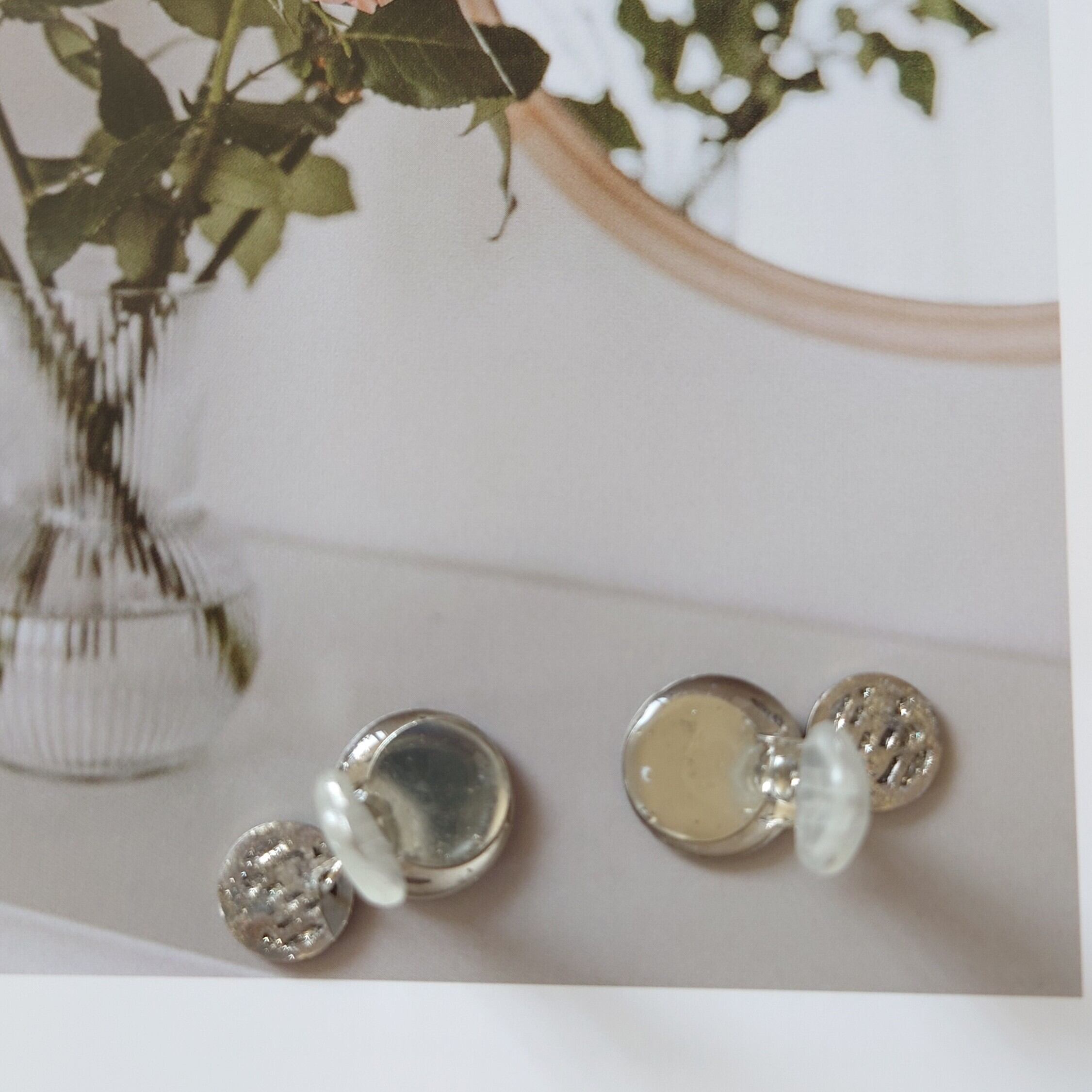 古典的で上品な印象を放つ、立体感のある装飾模様が美しいボタンを使用したイヤリング。