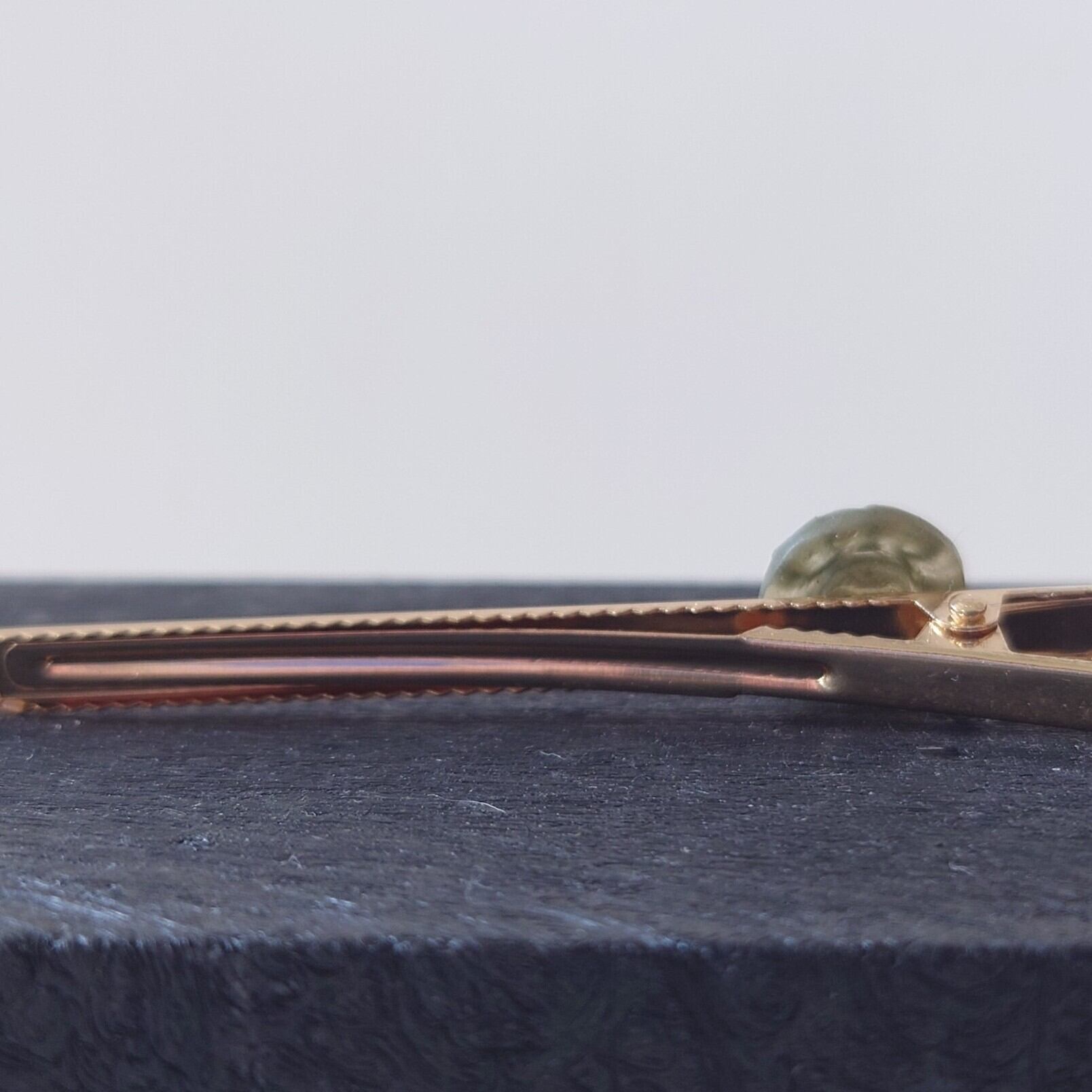 深いくすんだ緑が印象的なボタンをあしらったヘアピン。