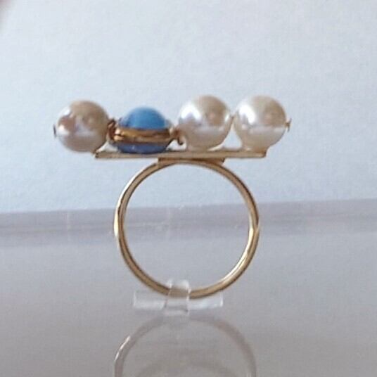 パールとブルーにゴールドの縁取りのガラスボタンが施されたゴールドリングは、華やかな存在感です。パーティーシーンはもちろん、普段使いにもおすすめです。どんなファッションにもマッチします。
